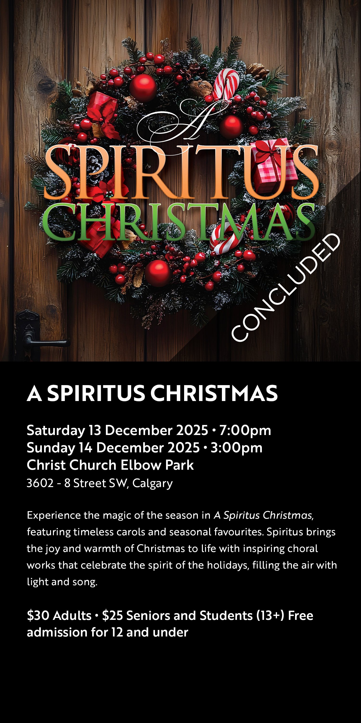 Experience the magic of the season in A Spiritus Christmas, featuring timeless carols and seasonal favourites. Spiritus brings the joy and warmth of Christmas to life with inspiring choral works that celebrate the spirit of the holidays, filling the air with light and song.